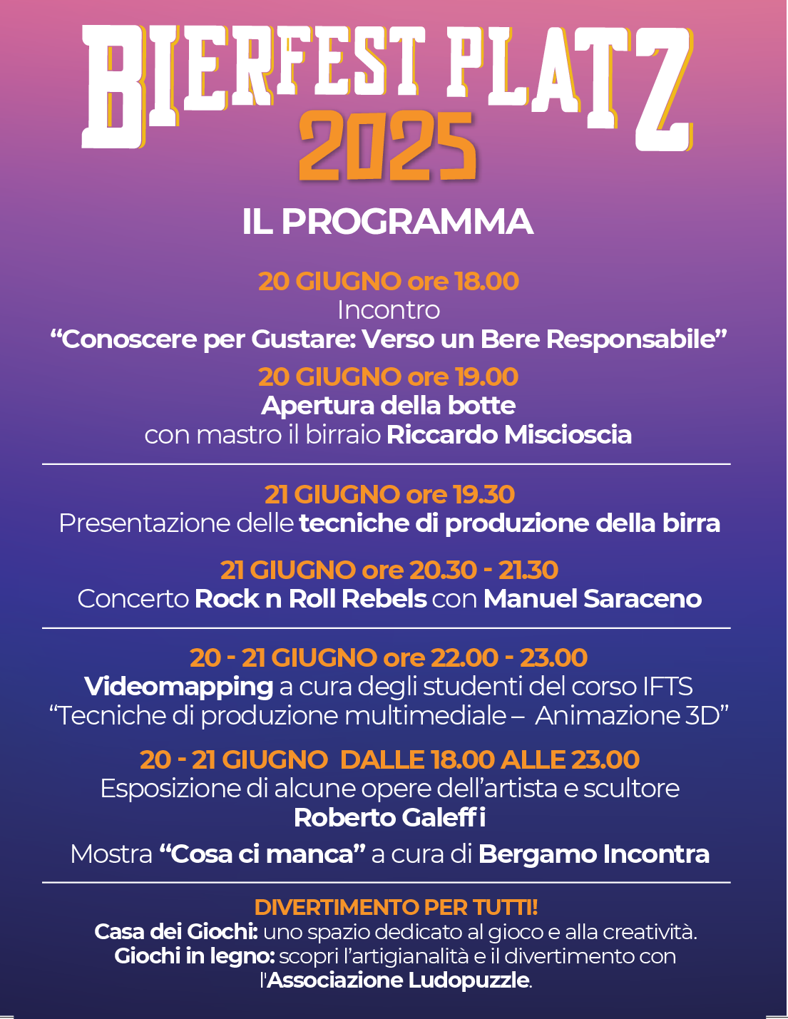 - uno spettacolo di videomapping che trasformerà la facciata della Piazza dei Mestieri in una tela viva, tra luci, immagini e musica.