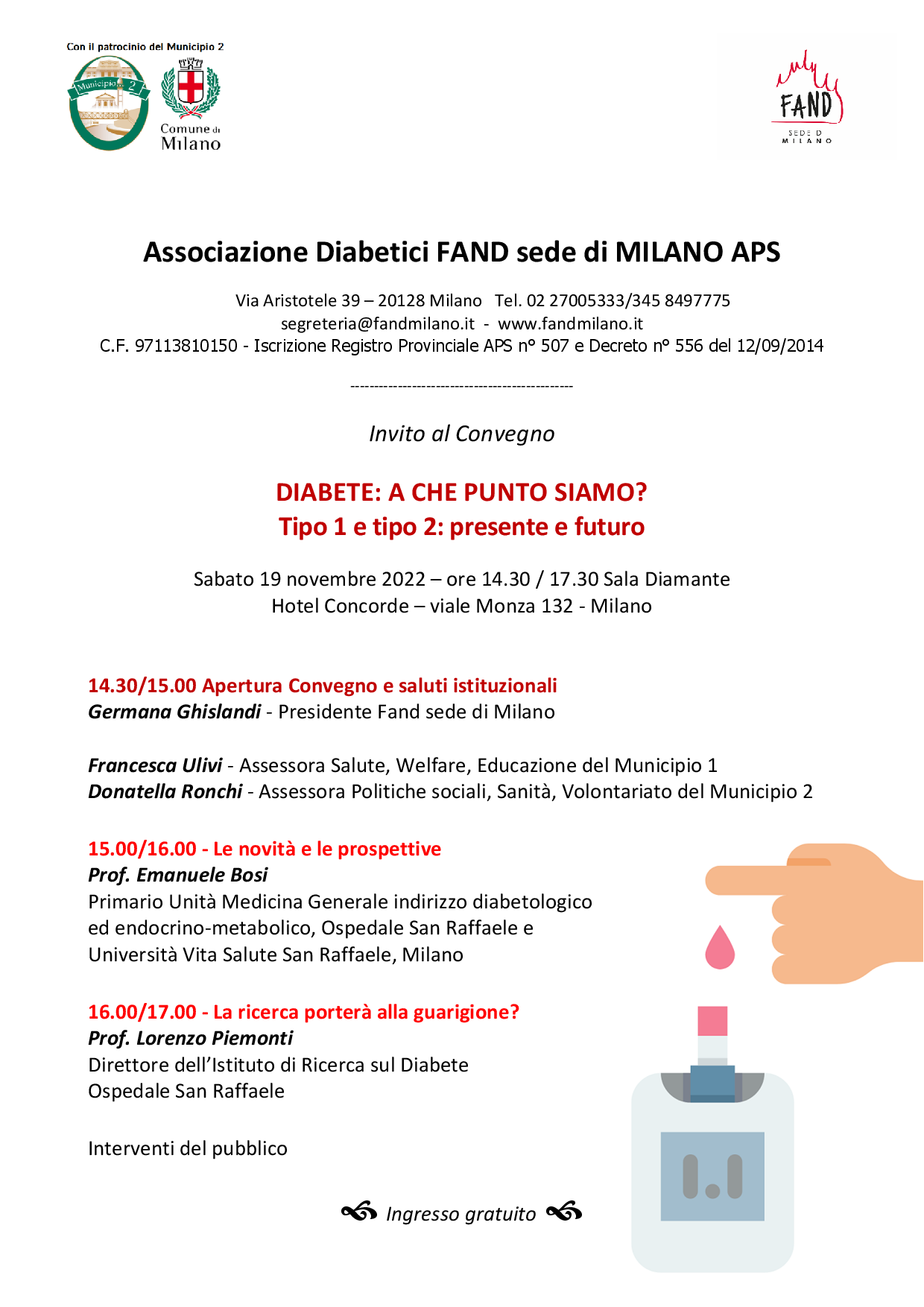 Realizzato dall'Associazione Diabetici FAND - Milano aps, col patrocinio del Municipio 2, l'incontro avrà il seguente programma: