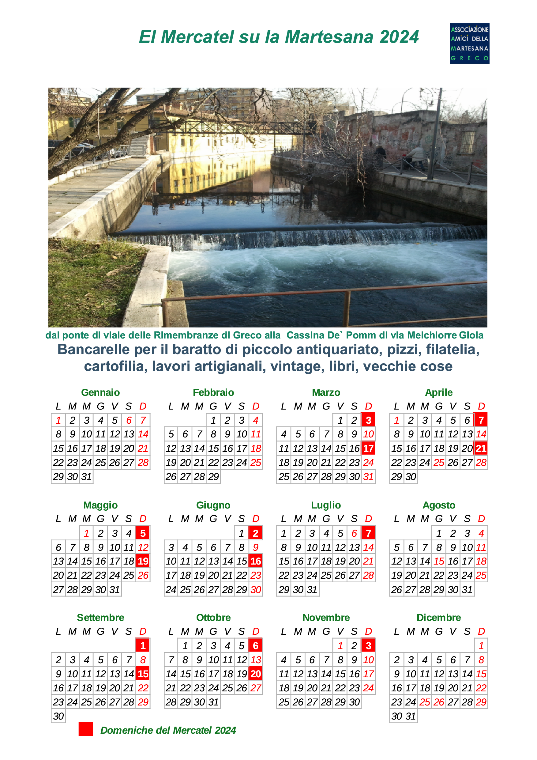 Per due domeniche al mese numerose bancarelle si disporranno lungo la Martesana, da viale Rimembranze di Greco (ponte) alla Cassina de’ Pomm di via Melchiorre Gioia, non professionali e molte a scopo benefico e gestite da volontari delle parrocchie o da altre associazioni di volontariato.
