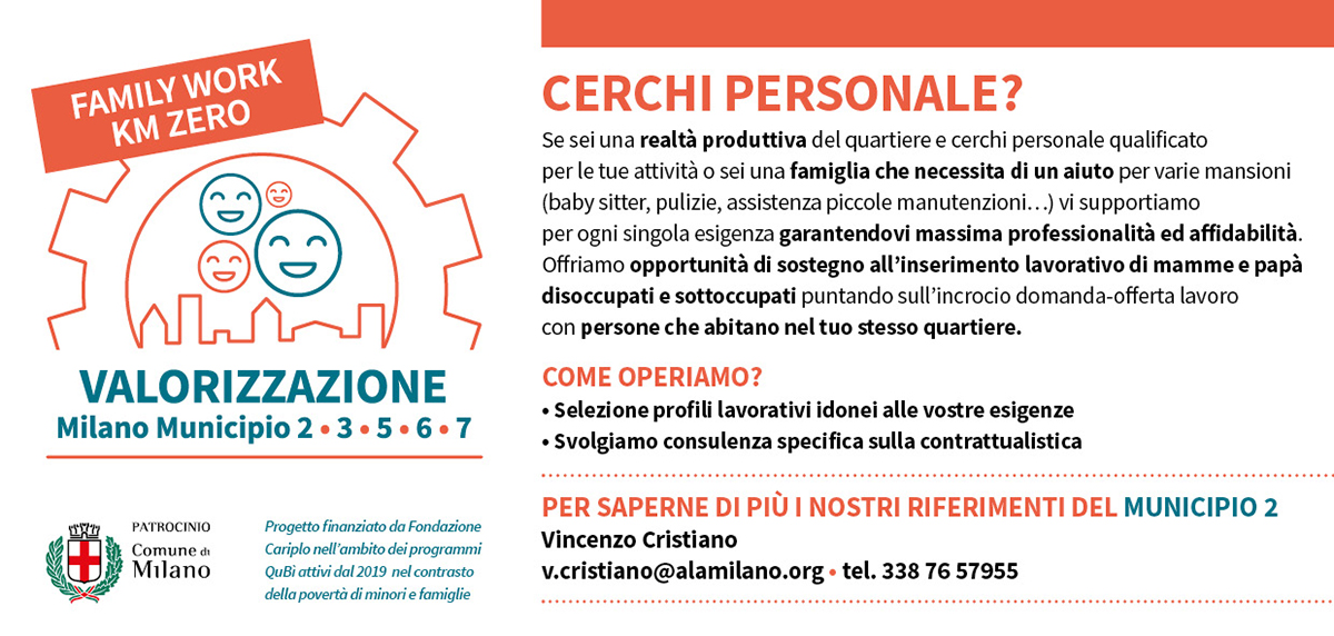 Se sei una realtà produttiva del quartiere e cerchi personale qualificato per le tue attività o sei una famiglia che necessita di un aiuto per varie mansioni (baby sitter, pulizie, assistenza piccole manutenzioni…), puoi ricevere supporto per ogni singola esigenza, con professionalità ed affidabilità.