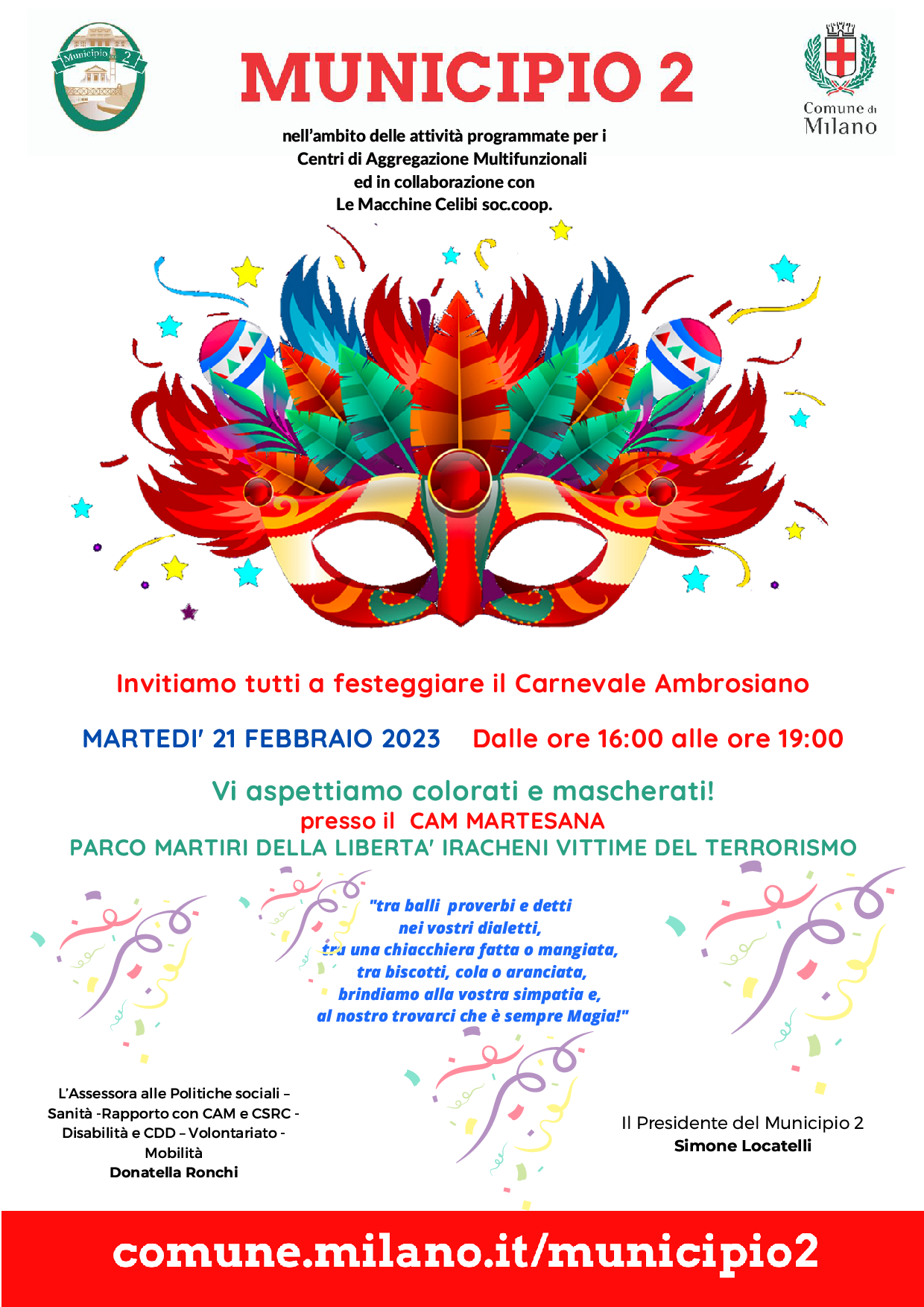 Milano, 17 febbraio 2023 - I Centri di Aggregazione Multifunzionali del Municipio 2 festeggiano il Carnevale Ambrosiano martedì 21 febbraio 2023 dalle 16:00 alle 19:00, nella sede del CAM Martesana - piazza Martiri della libertà iracheni vittime del terrorismo, con balli, storielle divertenti, merenda ed il brindisi di rito.