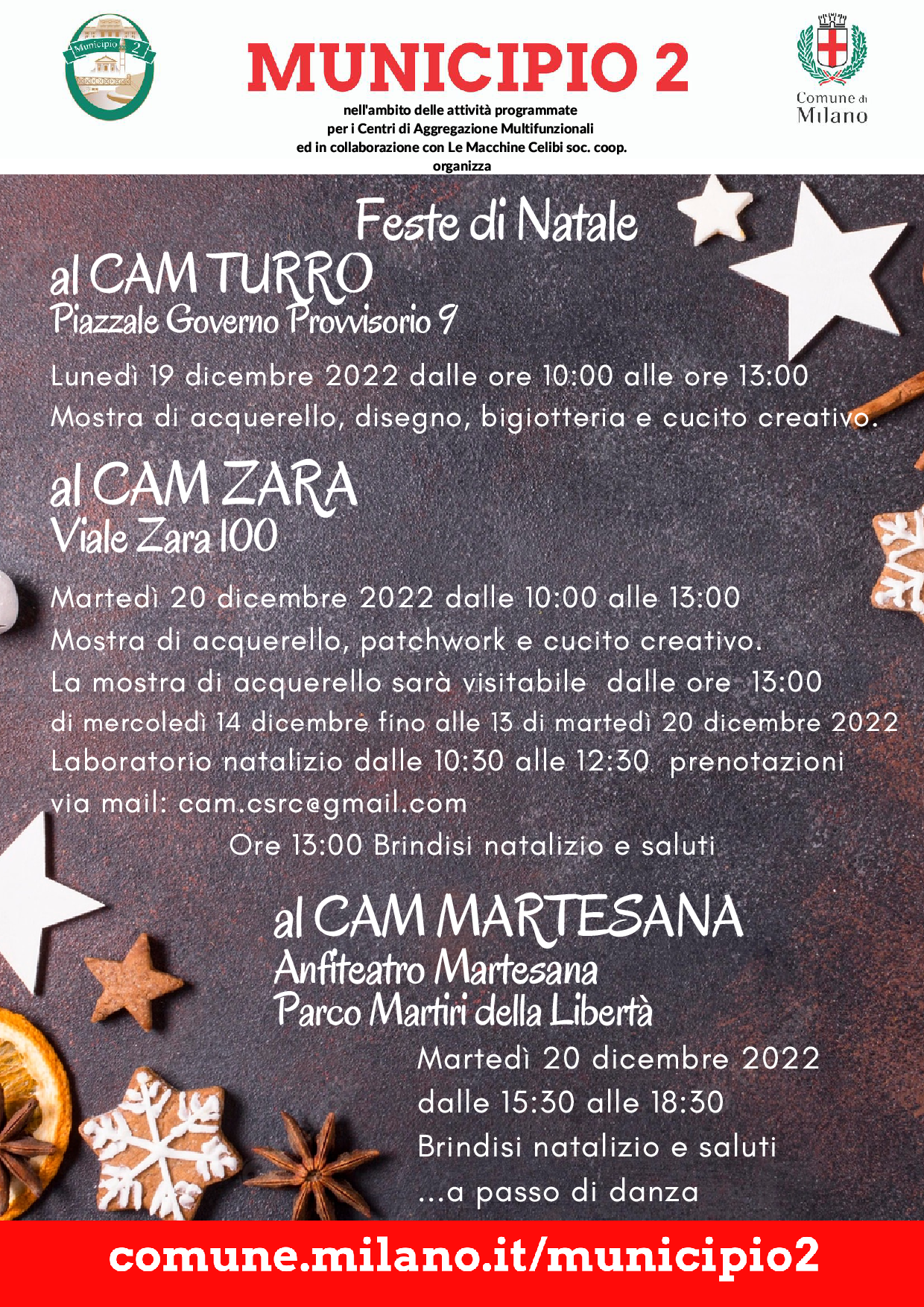 seguirà martedì 20 dicembre 2022 dalle 10:00 alle 13:00 al CAM ZARA di viale Zara 100, mostra di acquerello, patchwork e cucito creativo. La mostra di acquerello sarà visitabile dalle 13:00 di mercoledì 14 dicembre e fino alle 13:00 di martedì 20 dicembre 2022; laboratorio natalizio dalle 10:30 alle 12:30. Ore 13:00 Brindisi natalizio e saluti;