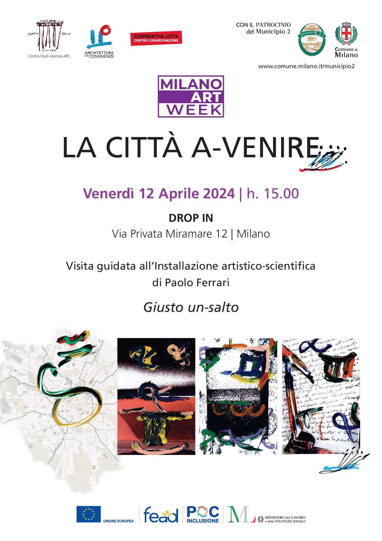 L'iniziativa fa parte del progetto CITTÀ A-VENIRE, nell'ambito di MILANO ART WEEK, e consiste in una visita guidata all'installazione artistico-scientifica "Giusto un-salto" di Paolo Ferrari, all'esterno e nella sala di soggiorno del DROP IN, in via privata Miramare 12, venerdì 12 aprile 2024 alle ore 15:00.