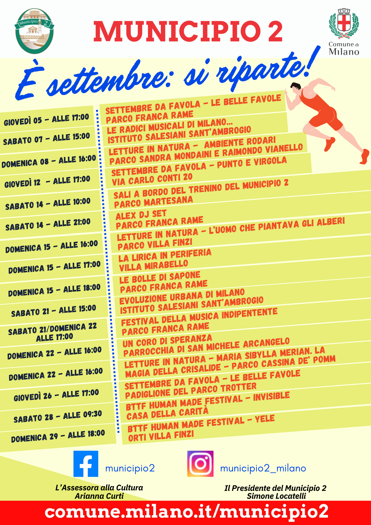 Tanti gli eventi del mese di settembre da non perdere, pensati dal Municipio 2 per tutti i gusti e tutte le età: concerti, incontri culturali, spettacoli per bambini, arte figurativa ed il sempre richiesto trenino su ruote. Non manca proprio nulla nel fitto programma di questo mese.