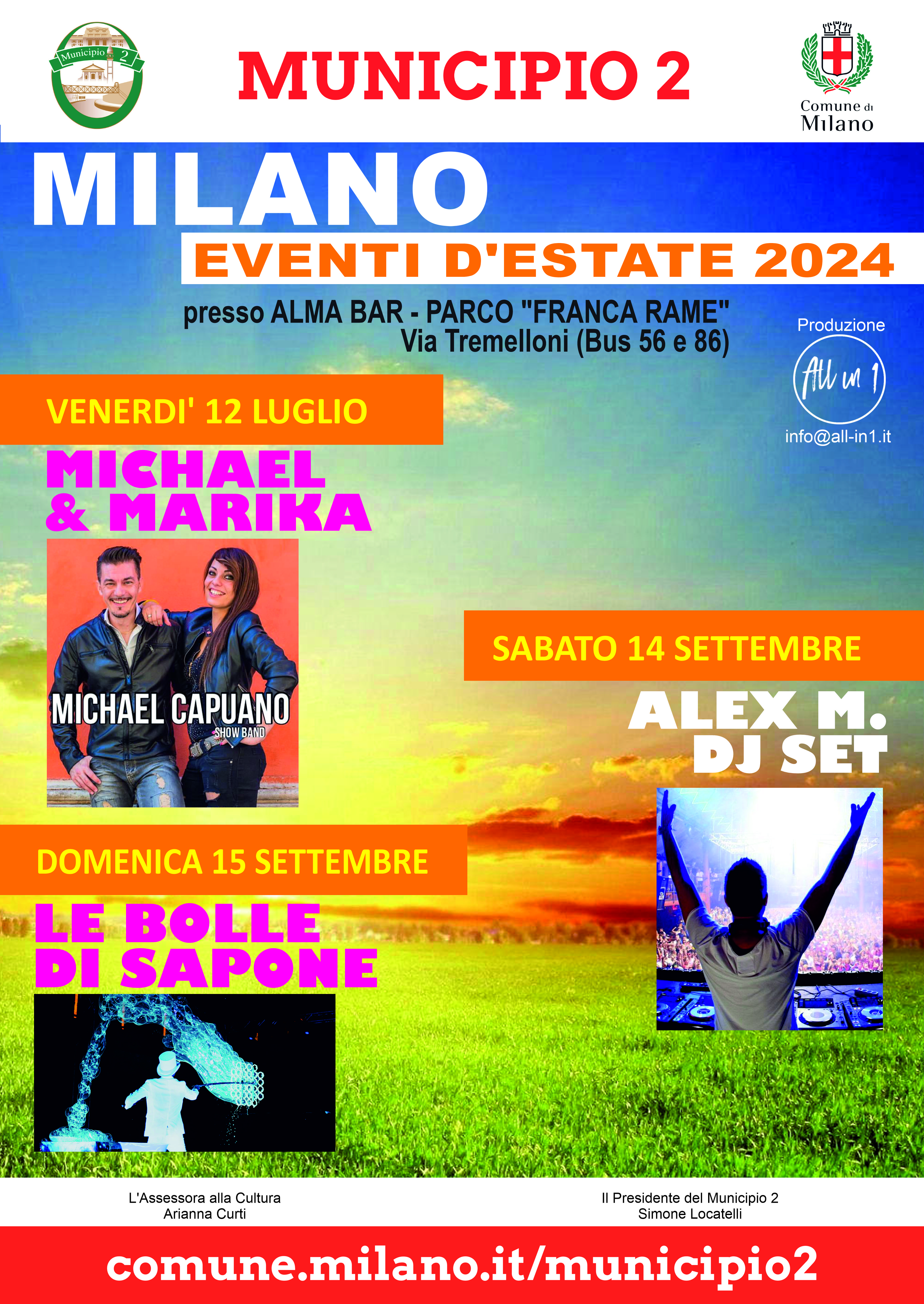 - lo spettacolo previsto per il 14.09.2024 alle 21:00 al parco Franca Rame, si svolgerà a Cascina Turro, piazzale Governo Provvisorio 9, stessa data e ora.