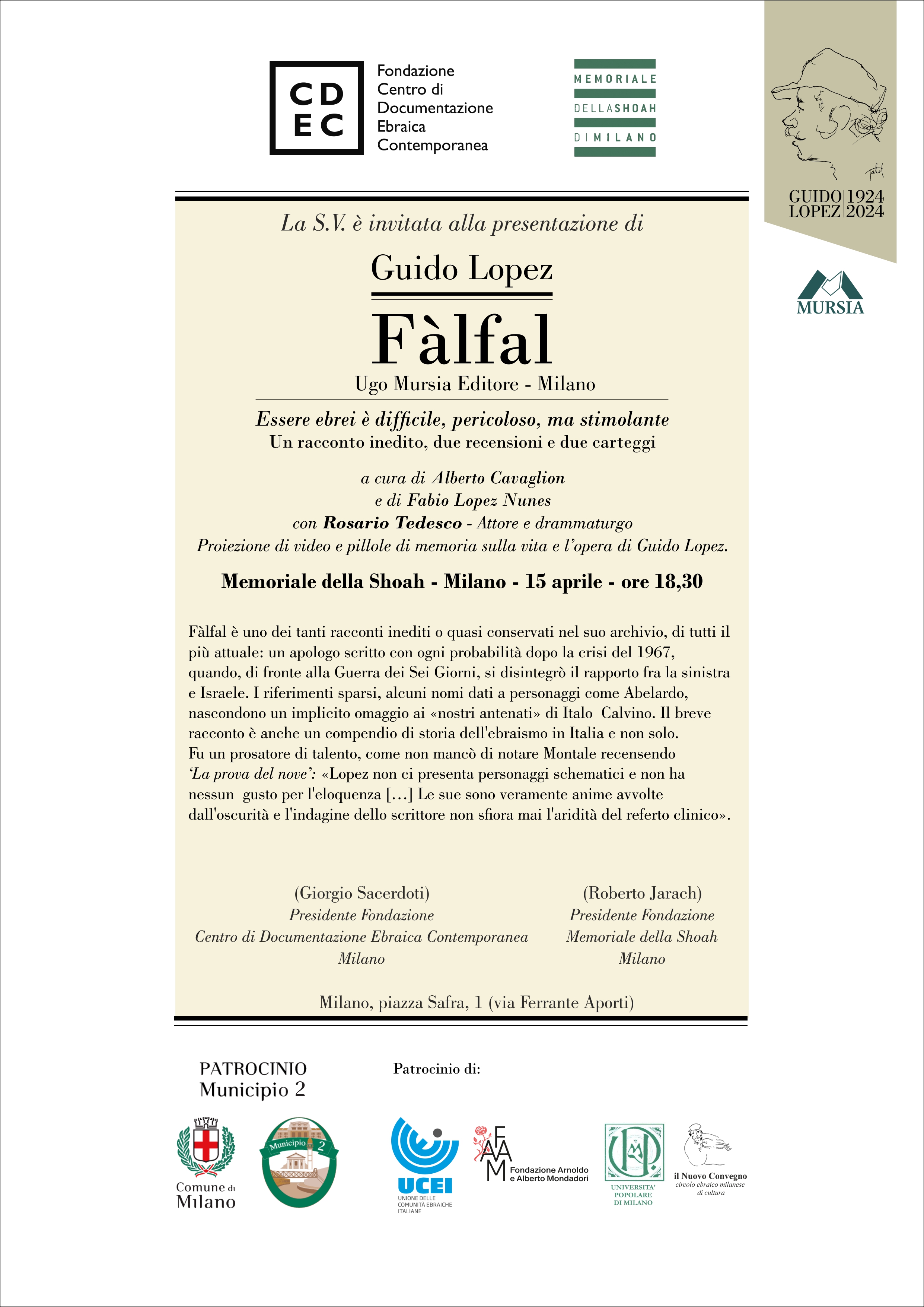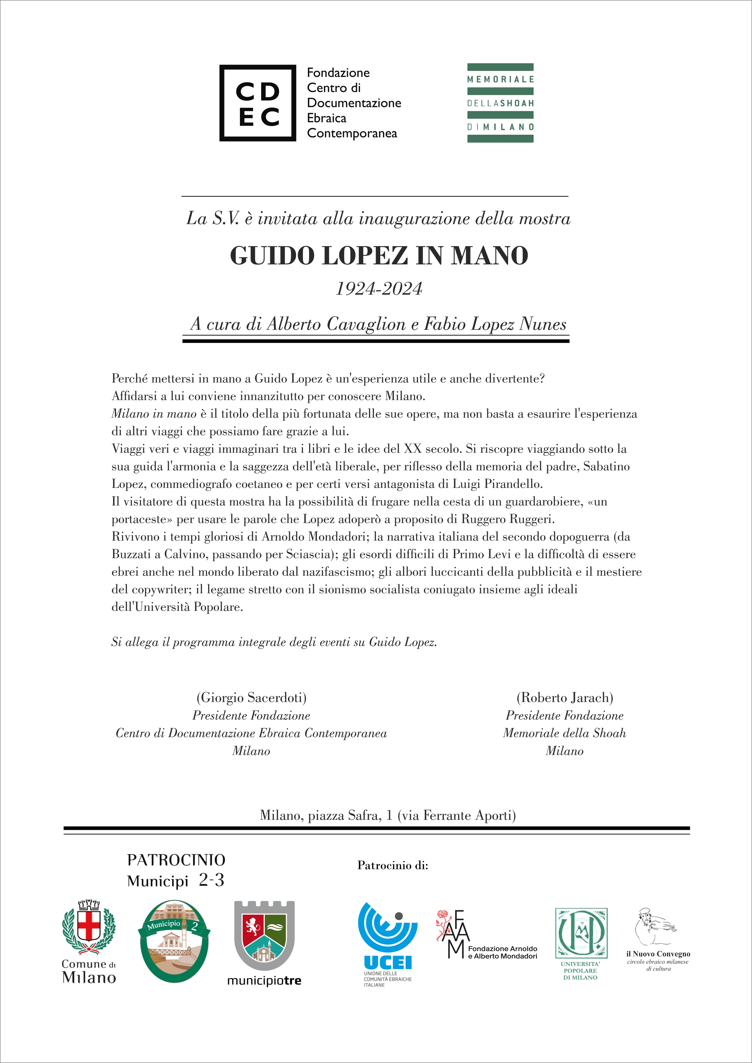 Il materiale sarà presentato con un’attenzione particolare verso il pubblico di ogni provenienza che visita il Memoriale, ponendo in evidenza la poliedrica figura di Guido Lopez. Vi saranno gli interventi introduttivi di Alberto Cavaglion e Fabio Lopez con il supporto di audiovisivi ed estratti di interviste a Guido Lopez.