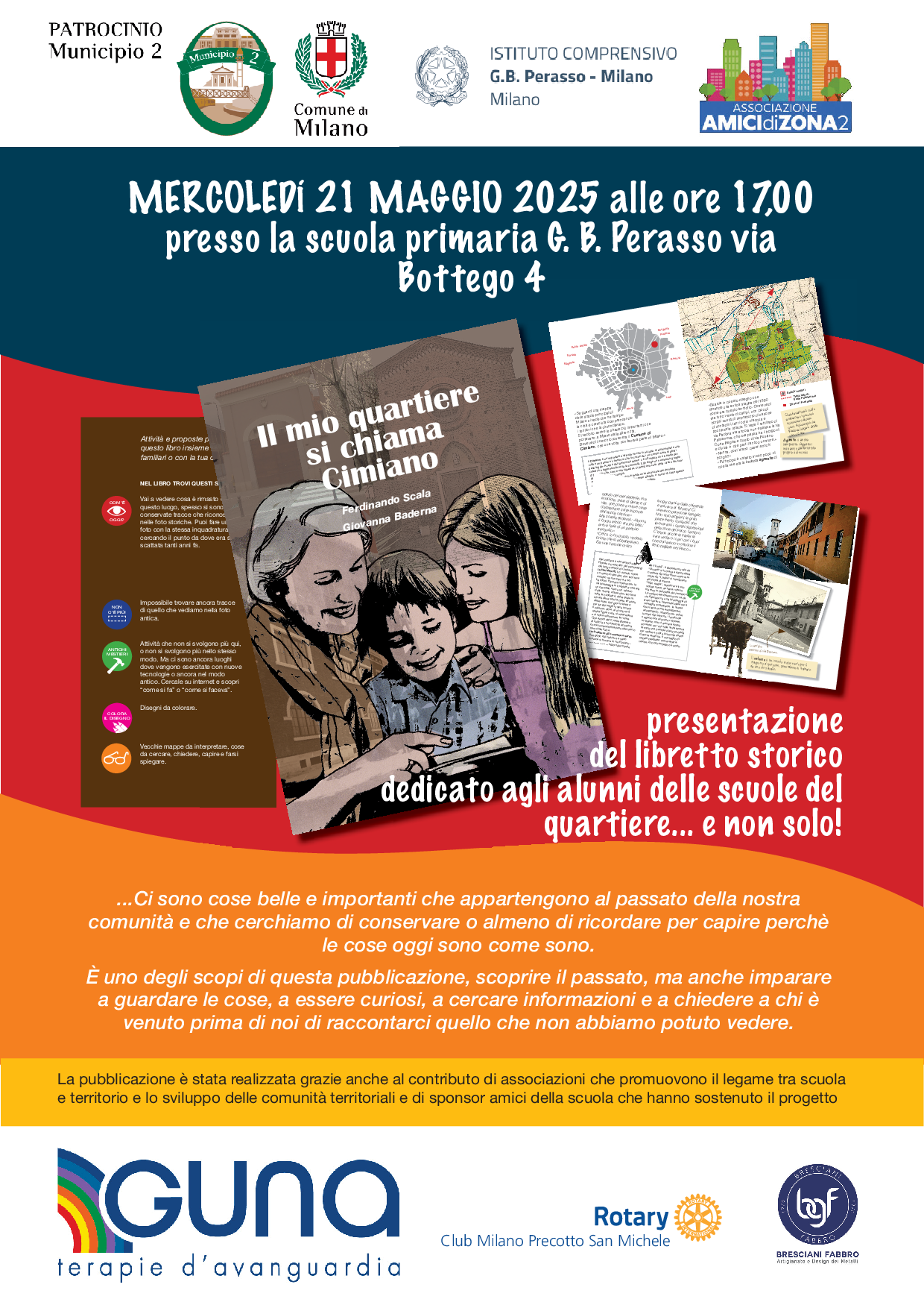 L'associazione Amici di Zona 2, in collaborazione con la scuola primaria G.B. Perasso, presenta il libretto sulla storia del quartiere Cimiano, realizzato a cura di Ferdinando Scala e Giovanna Baderna, dedicato agli alunni ma anche a tutta la cittadinanza.