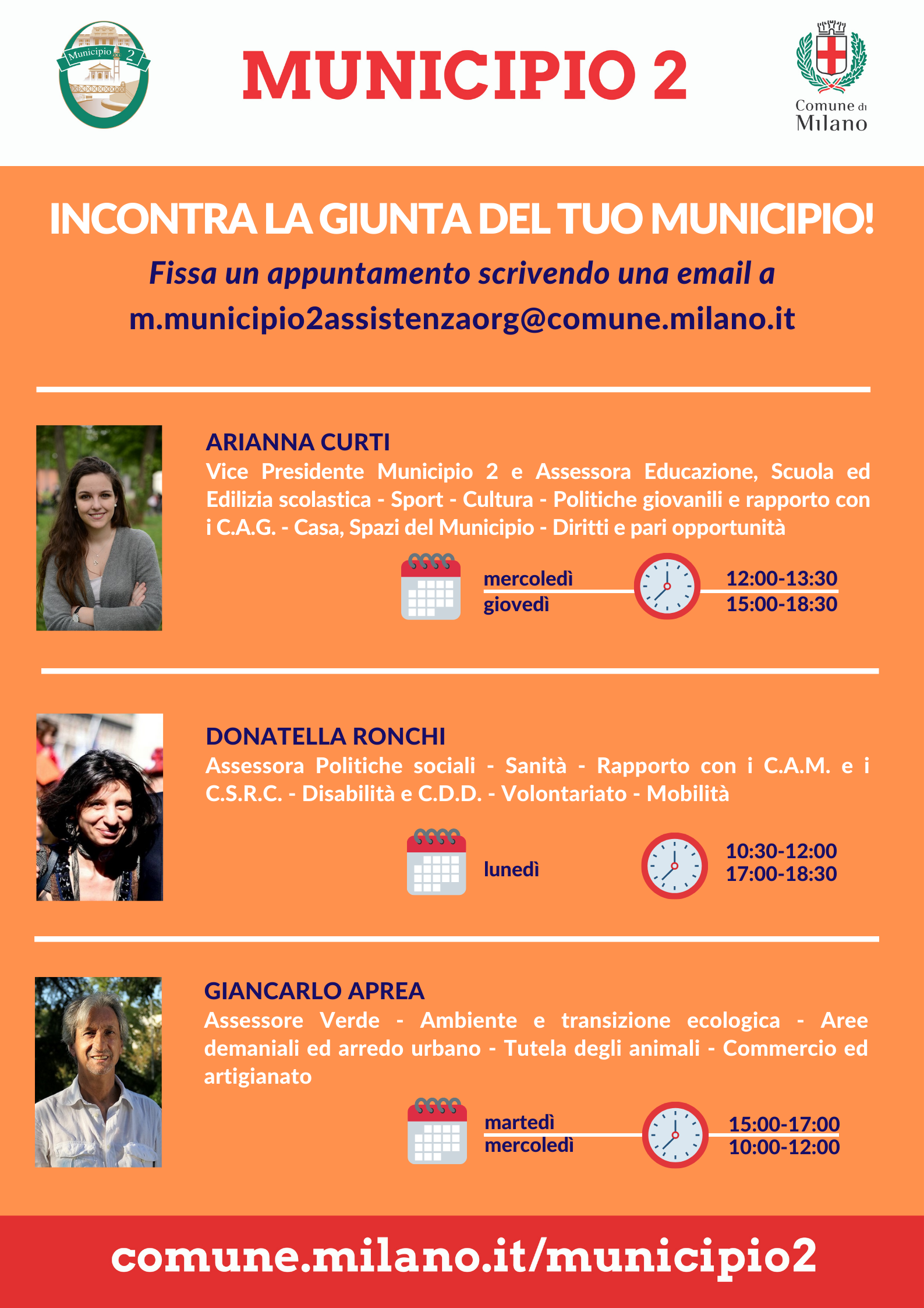 - Arianna Curti - Vice Presidente Municipio 2 e Assessora Educazione, Scuola ed Edilizia scolastica, Sport, Cultura, Politiche giovanili e rapporto con i C.A.G., Casa, Spazi del Municipio, Diritti e pari opportunità;