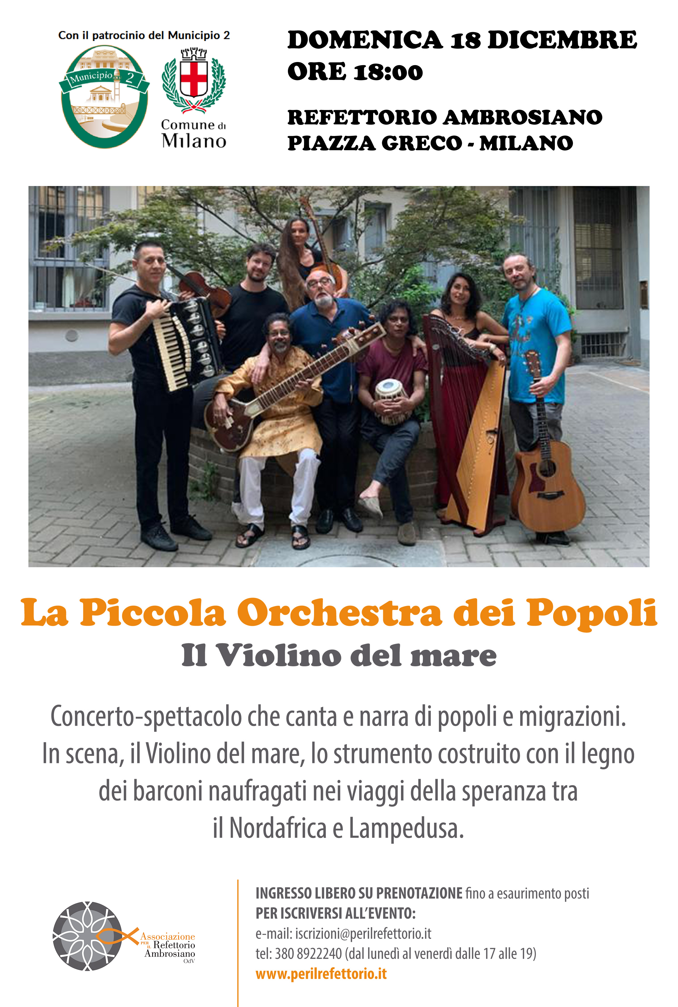 Milano, 10 dicembre 2022 - Domenica 18 dicembre 2022 alle ore 18:00, al Refettorio Ambrosiano di piazza Greco 11, arriva la Piccola Orchestra dei Popoli con Il violino del mare: una serata di musica, danza, letture e proiezioni, che narra le migrazioni di poli diversi del mondo attraverso i brani della propria tradizione musicale, suonati da musicisti di diverse nazionalità, con il violino costruito con il legno dei barconi naufragati a Lampedusa. La direzione artistica è affidata a Ciro Menale.