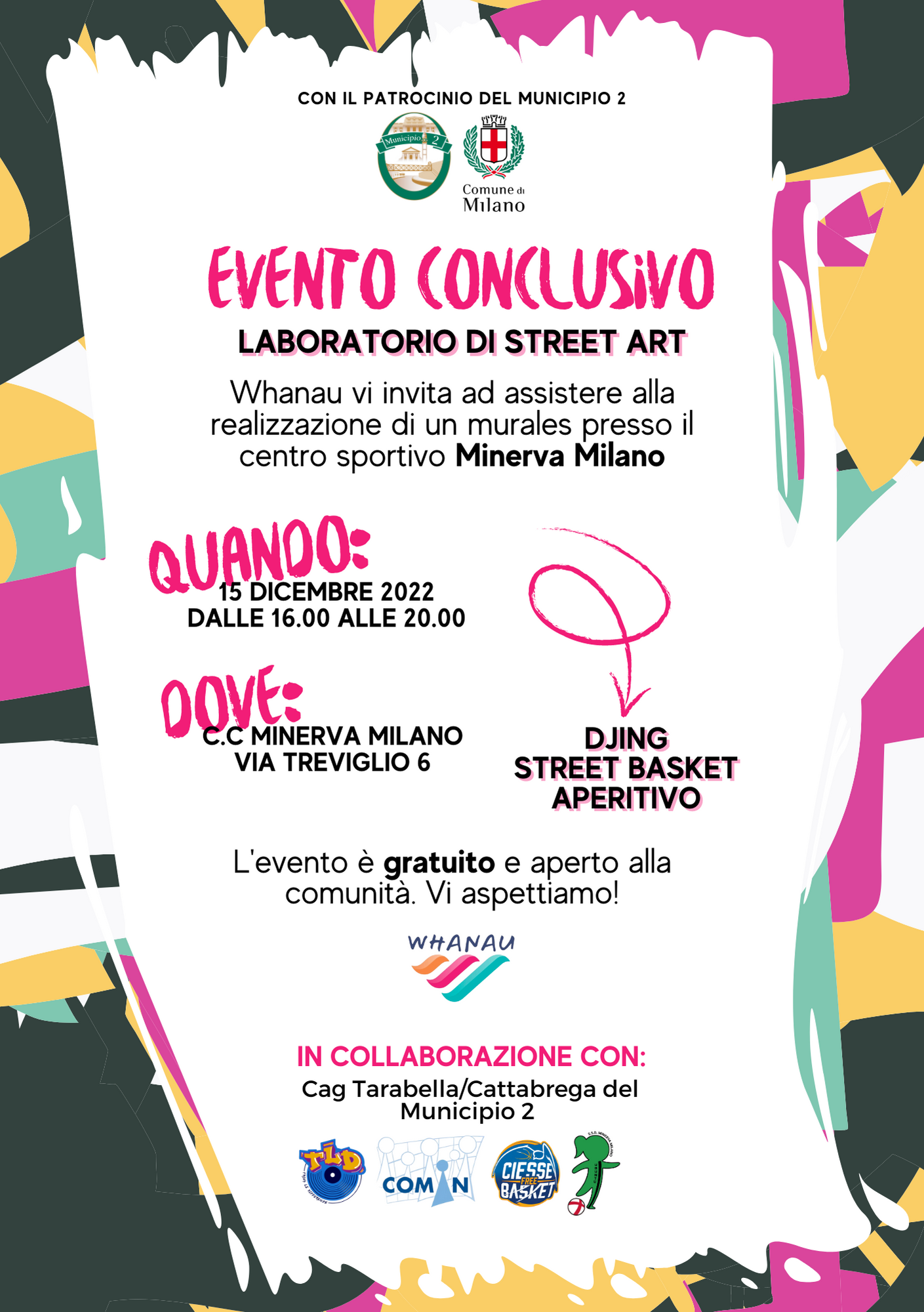 Milano 15 dicembre 2022 - Questo pomeriggio dalle 16:00 si terrà l'evento conclusivo del laboratorio di street art promosso da Whanau col patrocinio del Municipio 2, nel corso del quale verrà realizzato un murales presso il centro sportivo Minerva Calcio di via Treviglio 6, con attività sportive e djing.