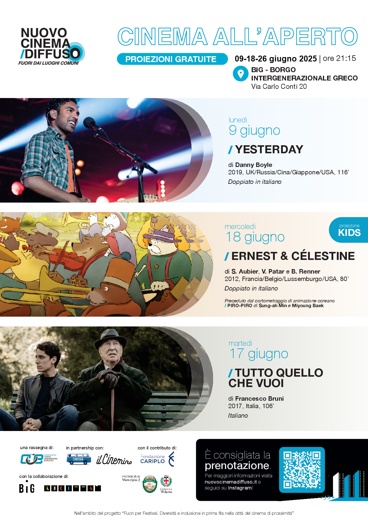 Nell'ambito del progetto realizzato dall’Associazione COE – Centro Orientamento Educativo in partenariato con l’Associazione culturale Cinevan e ASP Seiseneca per il Cinemino (bando “Per la Cultura” promosso dalla Fondazione Cariplo), si pone l’obiettivo di portare il cinema nei quartieri di Milano, in forma gratuita, al fine di creare momenti di condivisione e comunità promuovendo il cinema di prossimità a Milano mediante la realizzazione di proiezioni all’aperto nelle piazze e nei parchi municipali.
