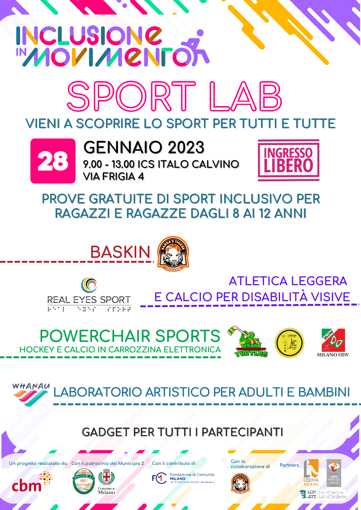 Milano, 27 gennaio 2023 - Una mattinata di sport organizzata nell'ambito del progetto di CBM Italia onlus "Inclusione in movimento", che coinvolge bambine/i e ragazze/i tra gli 8 e i 12 anni, le loro famiglie e la comunità del territorio del Municipio 2.