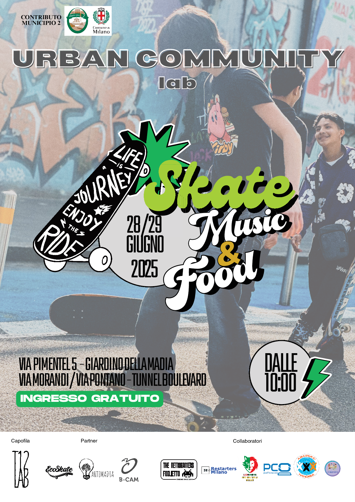 Urban Community Lab è un progetto di inclusione sociale, sport e cultura urbana che coinvolge le comunità giovanili che vivono nel quartiere di via Padova, già intercettate dal progetto Tunnel Boulevard attraverso Ecoskate con corsi ed eventi legati allo skateboarding, a cui si aggiungono i ragazzi disabili fisici e mentali del progetto Suono Risuono Lab, dell’Associazione Arte Madia ed i minori stranieri non accompagnati del progetto Figli Nostri dell’Associazione Abarekà Nandree Onlus, tutti già coinvolti dall’Associazione T12 Lab in progettualità legate all’urban art ed alla cultura underground; è quindi una comunità giovanile aperta, inclusiva, multiculturale, che vuole proporsi al quartiere attraverso eventi di urban art, azioni di skateboarding, performance musicali legate all’hip hop, attraverso un palinsesto variegato che coinvolgerà non solo tutta la comunità giovanile del quartiere di via Padova, ma anche le famiglie e i bambini più piccoli attraverso laboratori/performance/azioni sportive aperte a tutti.